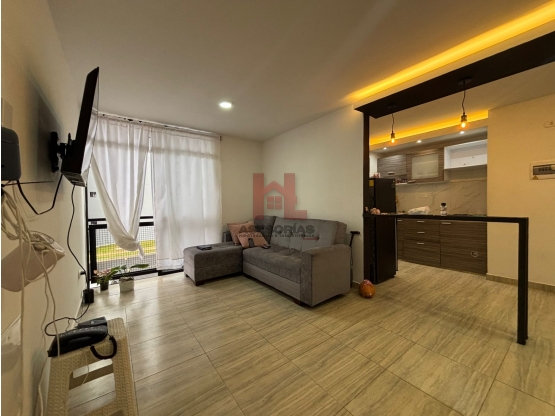 El apartamento cuenta con piso en ceramica, iluminacion calida, moderna, cocina con muebles, calentador a gas, baño con division en acrilico, 2 habitaciones auxiliares sin closets ni puertas, principal con closet de pared a pared y puerta, parqueadero propio, el conjunto cuenta con gimnasio, piscinas, zonas BBQ, parque infantil, porteria 24/7